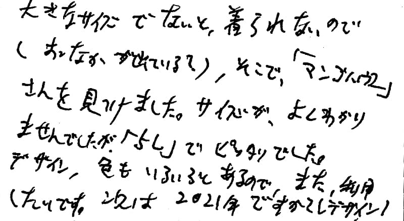 大きなサイズでないと、着られないので、(おなかが出ている?)そこで、「マンゴハウス」さんを見つけました。サイズが、よくわかりませんでしたが「5L」でピッタリでした。デザイン、色もいろいろとあるので、また、利用したいです。2021年ですか?(デザイン)