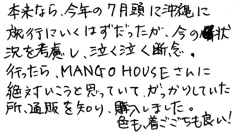 本来なら、今年の7月頭に沖縄に旅行に行くはずだったが、今の現状を考慮し、泣く泣く断念。言ったらMANGO HOUSEさんに絶対行こうと思っていて、がっかりしていた所、通販を知り、購入しました。色も着ごこちも良い!