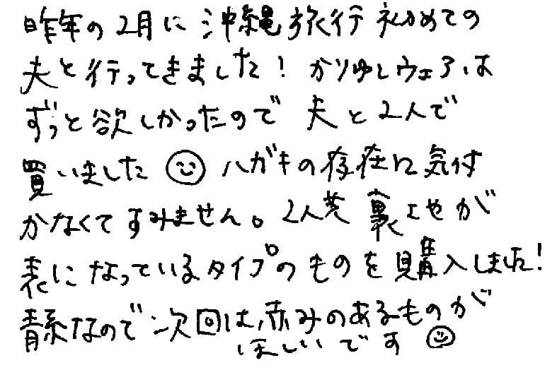 昨年の2月に沖縄旅行初めての夫と行きました!かりゆしウェアはずっと欲しかったので夫と2人で会いました。はがきの存在に気付かなくてすいません。2人共うっらじが表になっているタイプのものを購入しました!青系なので次回は赤身のあるものが欲しいです。