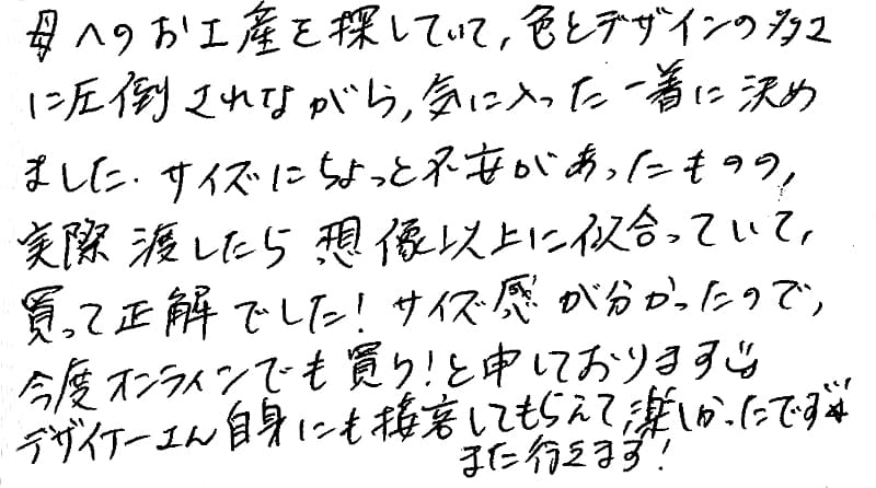 母へのお土産を探していて、色とデザインの多さに圧倒されながら、気に入った一着に決めました。サイズにちょっと不安があったものの、実際渡したら想像以上に似合っていて、買って正解でした!サイズ感が分かったので、今度オンラインでも買う!と申しております。 デザイナーさん自身にも接客してもらえて楽しかったです。また行きます。
