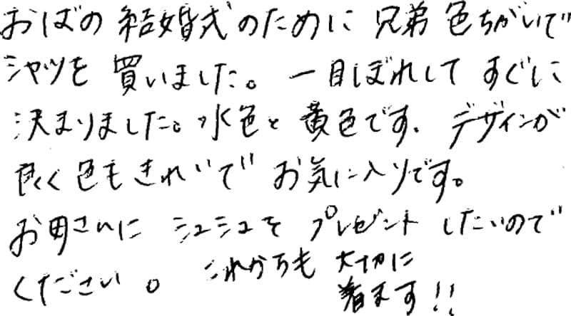 おばの結婚式のために兄弟色ちがいでシャツを買いました。一目ぼれしてすぐに決まりました。水色と黄色です。デザインが良く色もきれいでお気に入りです。お母さんにシュシュをプレゼントしたいのでください。これからも大切に着ます!!