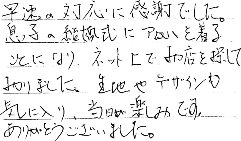早速の対応に感謝でした。息子の結婚式にアロハを着ることになり、ネット上でお店を探しておりました。生地もデザインも気に入り、当日が楽しみです。ありがとうございました。