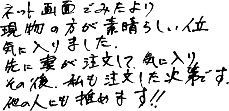 ネット画面でみたより現物の方が素晴らしい位気に入りました。先に妻が注文して、気に入りその後、私も注文した次第です。他の人にも推めます!!