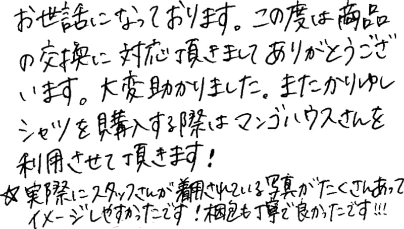 お世話になっております。この度は商品の交換に対応頂きましてありがとうございます。大変助かりました。またかりゆしシャツを購入する際はマンゴハウスさんを利用させて頂きます!☆実際スタッフさんが着用されている写真がたくさんあってイメージしやすかったです!梱包も丁寧で良かったです!!!