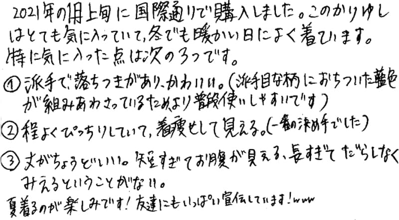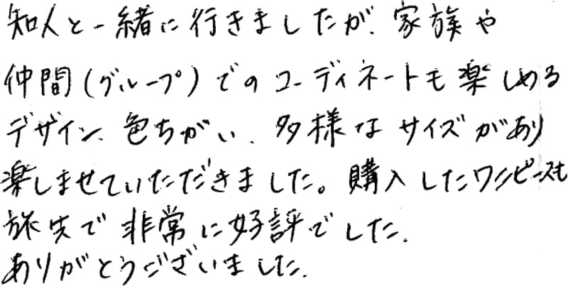 知人と一緒に行きましたが、家族や仲真(グループ)でのコーディネートも楽しめるデザイン、色ちがい、多様なサイズがあり楽しませていただきました。購入したワンピースも旅先で非常に好評でした。ありがとうございました。