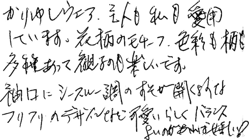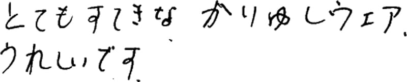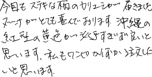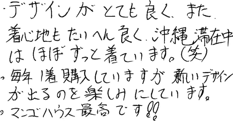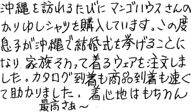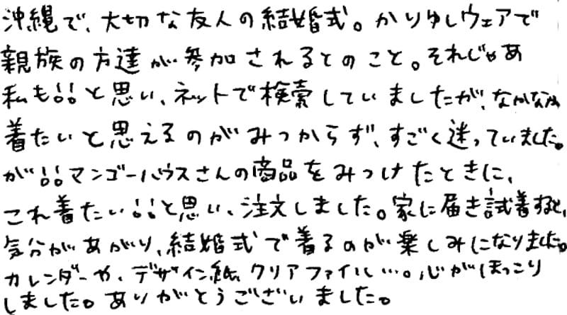 沖縄で、大切な友人の結婚式。かりゆしウェアで親族の方達が参加されるとのこと。それじゃあ私も!!と思い、ネットで検索していましたが、なかなか着たいと思えるのがみつからず、すごく迷っていました。が!!マンゴーハウスさんの商品を見つけたときに、これ着たい!!と思い、注文しました。家に届き試着すると、気分があがり、結婚式で着るのが楽しみになりました。カレンダーや、デザイン紙クリアファイル・・・。心がほっこりしました。ありがとうございました。