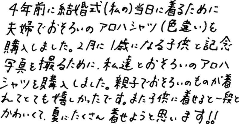4年前に結婚式(私の)当日に着るために夫婦でおそろいのアロハシャツ(色違い)を購入しました。2月に1歳になる子供と記念写真を撮るために、私達とおそろいのアロハシャツを購入しました。親子でおそろいのものが着れてとても嬉しかったです。また子供に着せると一段とかわいくて、夏にたくさん着せようと思います!!