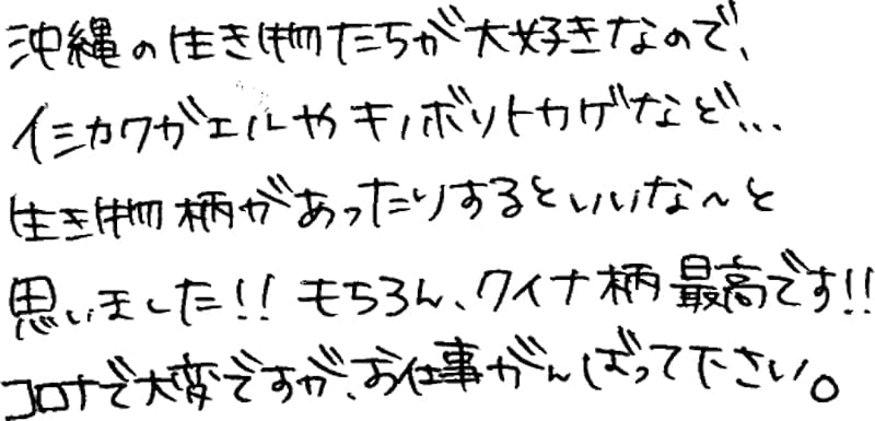 沖縄の生き物たちが大好きなので、イシカワガエルやキノボリトカゲなど…生き物柄があったりするといいな~と思いました!!もちろん、クイナ柄最高です!!コロナで大変ですが、お仕事がんばって下さい。