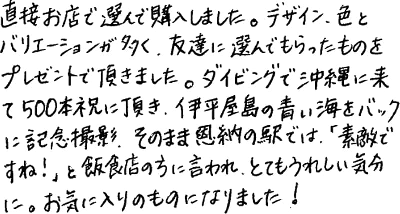 直接お店で選んで購入しました。デザイン、色とバリエーションが多く、友達に選んでもらったものをプレゼントで頂きました。ダイビングで沖縄に来て500本祝に頂き、伊平屋島の青い海をバックに記念撮影、そのまま恩納の駅では、「素敵ですね!」と飲食店の方に言われ、とてもうれしい気分に。お気に入りのものになりました!