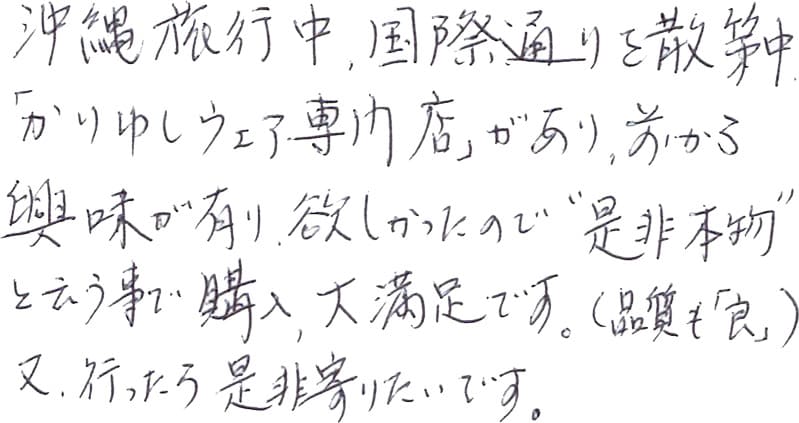 沖縄旅行中、国際通りを散策中、「かりゆしウェア専門店」があり、前から興味が有り、欲しかったので”是非本物”と云う事で購入、大満足です。(品質も「良」)又、行ったら是非寄りたいです。