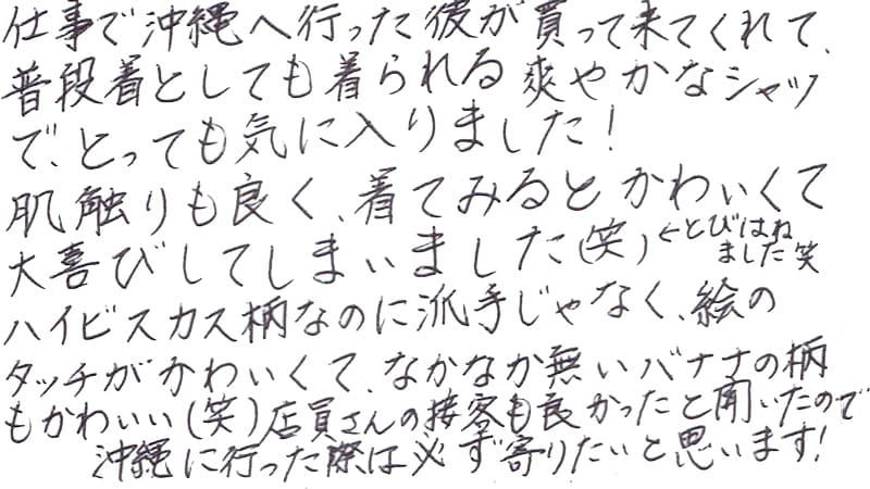 仕事で沖縄へ行った彼が買って来てくれて、普段着としても着られる爽やかなシャツで、とっても気に入りました!肌触りも良く、着てみるとかわいくて大喜びしてしまいました(笑)←とびはねました 笑