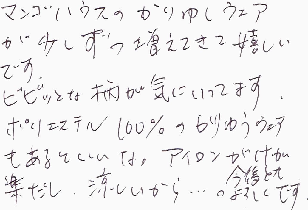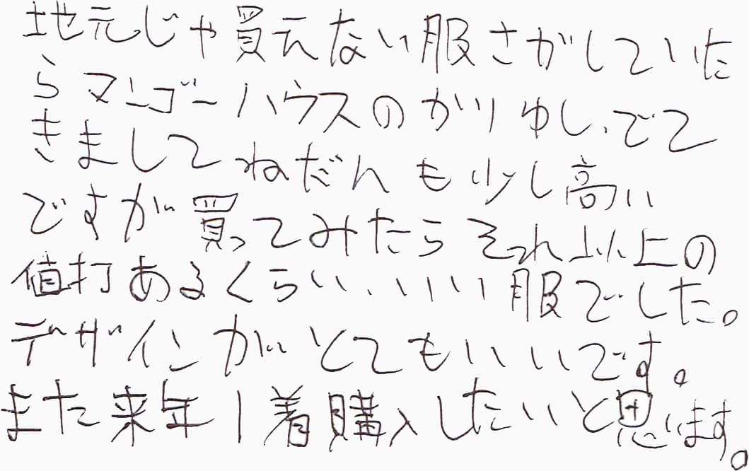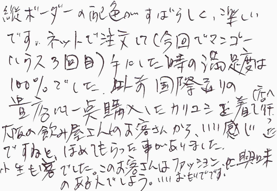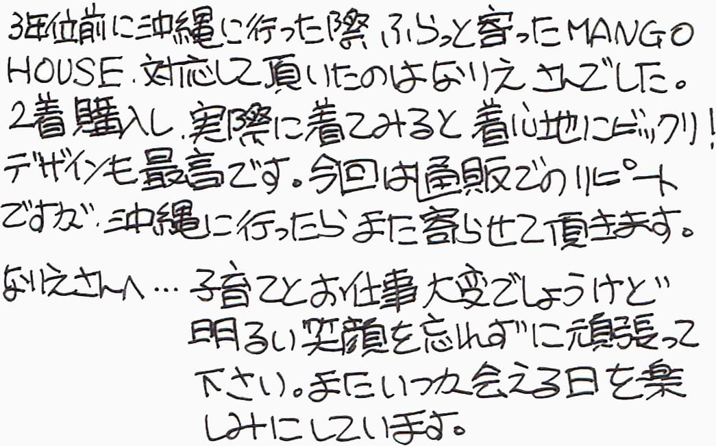 3年位前に沖縄に行った際ふらっと寄ったMANGO HOUSE。対応して頂いたのはなりえさんでした。2着購入し、実際に着てみると着心地にビックリ!デザインも最高です。今回は通販でのリピートですが、沖縄に行ったらまた寄らせて頂きます。なりえさんへ…子育てとお仕事大変でしょうけど明るい笑顔を忘れずに頑張って下さい。またいつか会える日を楽しみにしています。