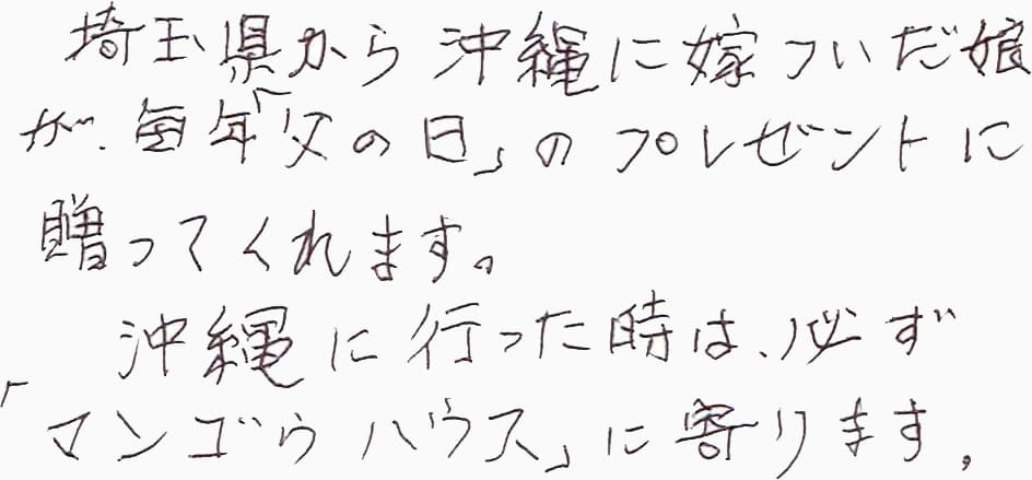 埼玉県から沖縄に嫁いだ娘が、毎年「父の日」のプレゼントに贈ってくれます。沖縄に行った時は、必ず「マンゴウハウス」に寄ります。