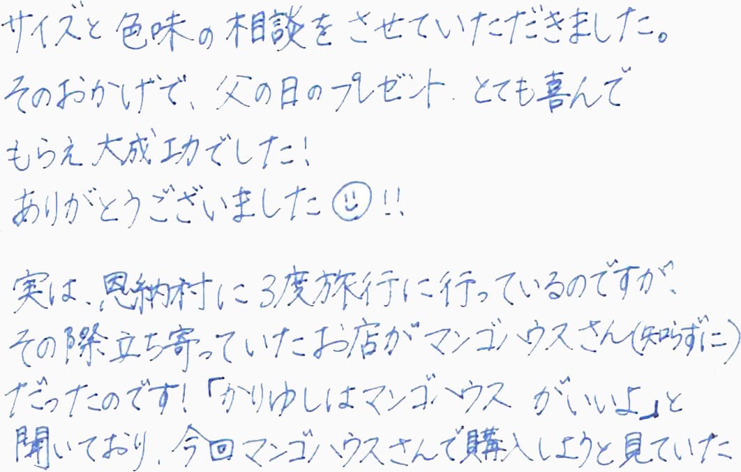 サイズと色味の相談をさせていただきました。そのおかげで、父の日のプレゼント、とても喜んでもらえ大成功でした!ありがとうございました!!実は、恩納村に3度旅行に行っているのですが、その際立ち寄っていたお店がマンゴハウスさん(知らずに)だったのです!「かりゆしはマンゴハウスがいいよ」と聞いており、今回マンゴハウスさんで購入しようと見ていたので、あとから気づいた偶然でした!!