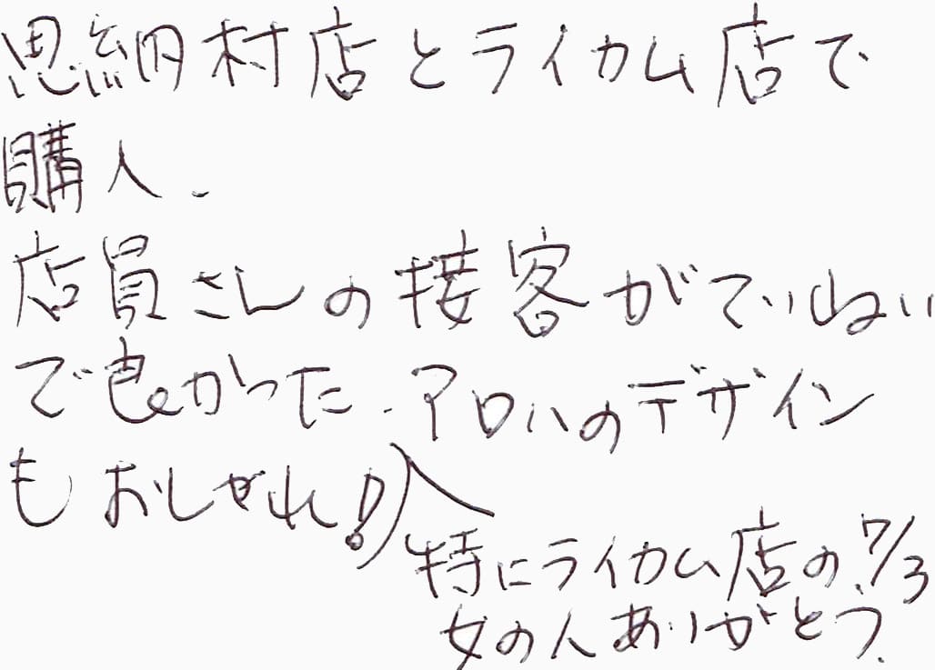 恩納村店とライカム店で購入。店員さん接客がていねいで良かった。特にライカム店の7/3女の人ありがとう。アロハのデザインもおしゃれ!