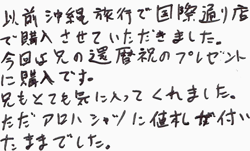 以前沖縄旅行で国際通り店で購入させていただきました。今回は兄の還暦祝いのプレゼントに購入です。兄もとても気に入ってくれました。ただアロハシャツに値札が付いたままでした。