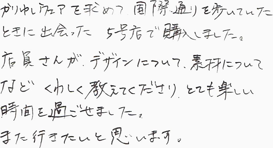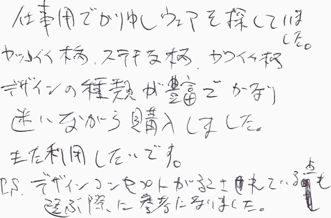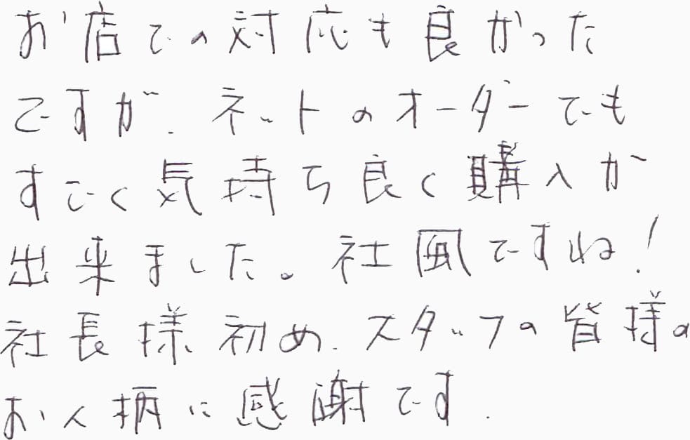 お店での対応も良かったですが、ネットのオーダーでもすごく気持ち良く購入か出来ました。社風ですね!社長様初め、スタッフの皆様のお人柄に感謝です。