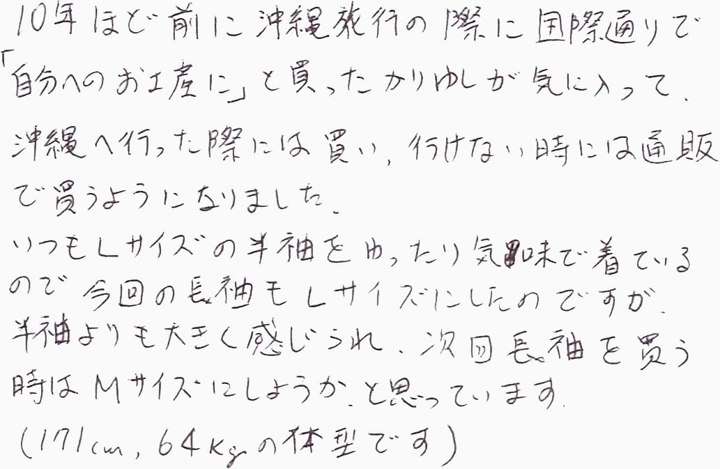 10年ほど前に沖縄旅行の際に国際通りで「自分へのお土産に」と買ったかりゆしが気に入って、沖縄へ行った際には買い、行けない時には通販で買うようになりました。いつもLサイズの半袖をゆったり気味で着ているので今回の長袖もLサイズもLサイズにしたのですが、半袖よりも大きく感じられ、次回長袖を買う時はMサイズにしようかと思っています。(171㎝、64㎏の体型です)
