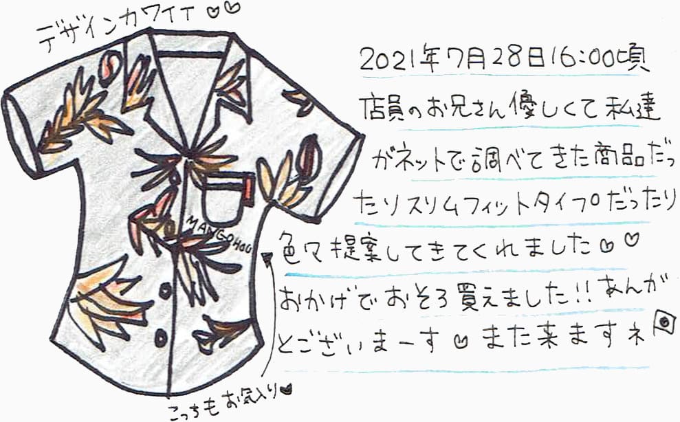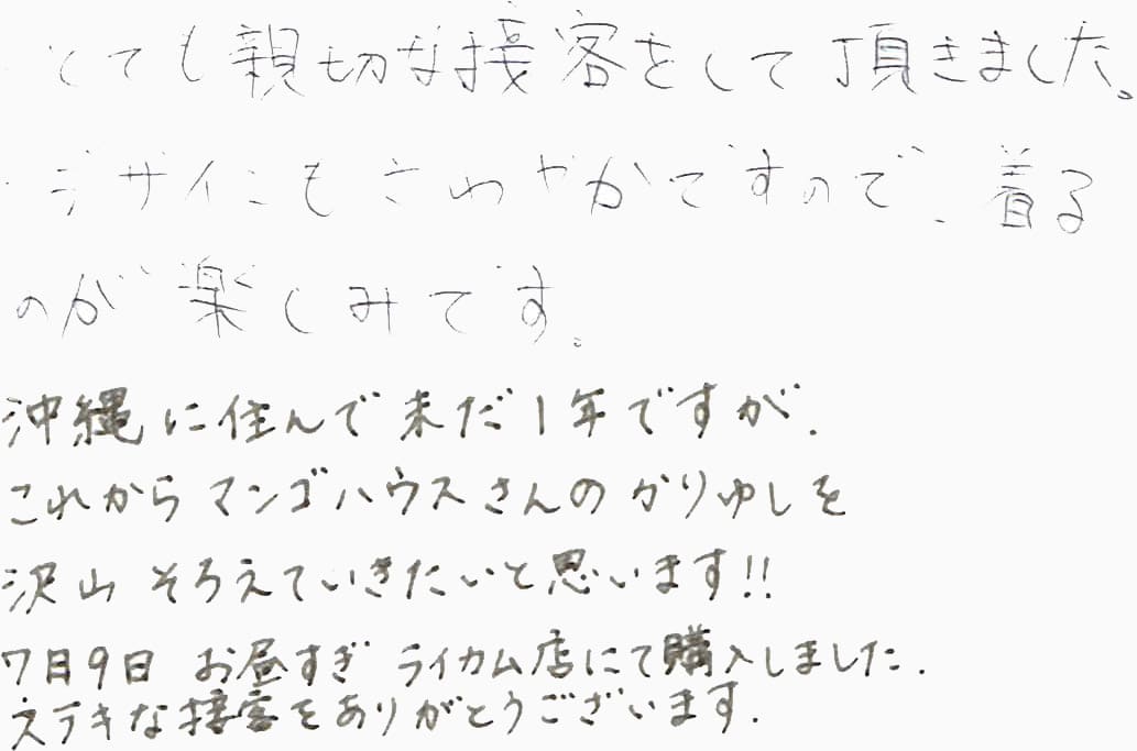 ・とても親切な接客をして頂きました。・デザインもさわやかですので、着るのが楽しみです。沖縄に住んで未だ1年ですが、これからマンゴハウスさんのかりゆしを沢山そろえていきたいと思います!!7月9日お昼過ぎライカム店にて購入しました。ステキな接客をありがとうございます。