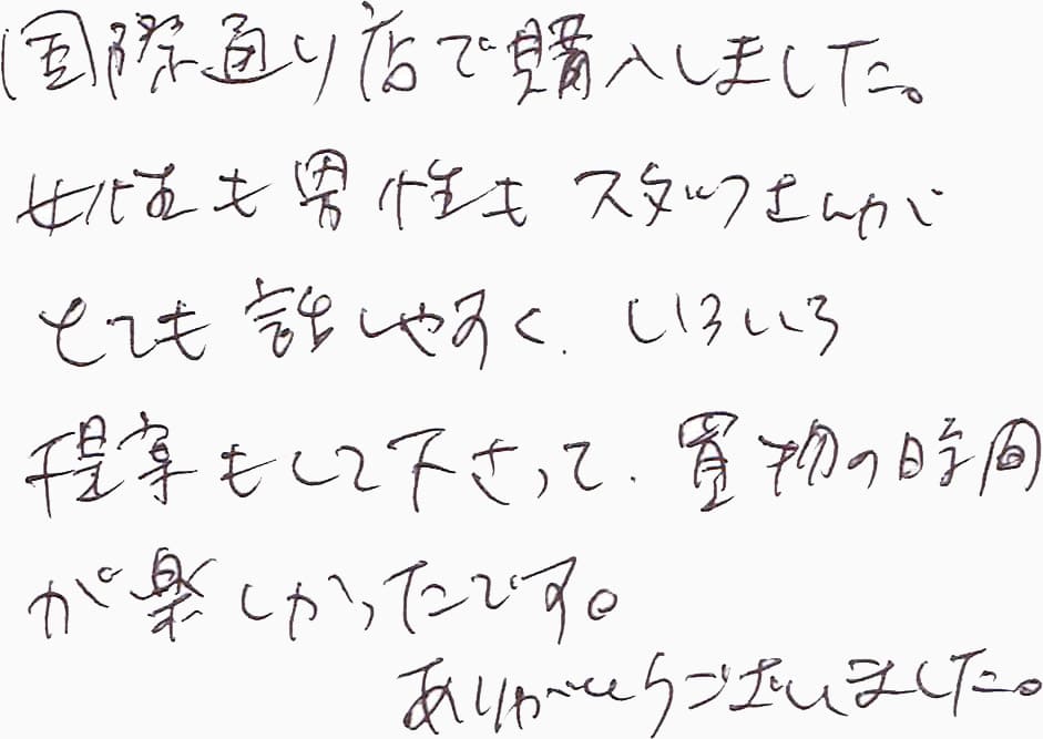 国際通り店で購入しました。女性も男性もスタッフさんがとても話しやすく、いろいろ提案もして下さって、買物の時間が楽しかったです。ありがとうございました。