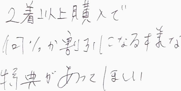 2着以上購入で何%か割引になる様な特典があってほしい。