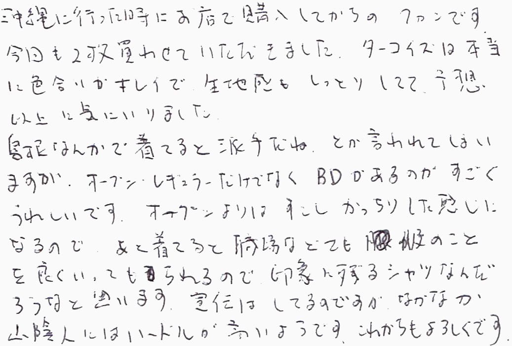 沖縄に行った時にお店で購入してからのファンです。今回も2枚買わせていただきました。ターコイズは本当に色合いがキレイで生地感もしっとりしてて、予想以上に気にいりました。島根なんかで着てると派手だね、とか言われてしまいますが、オープン・レギュラーだけでなくBDがあるのがすごくうれしいです。オープンよりはすこしかっちりした感じになるので、あと着てると職場などでも服のことを良くいってもらえるので、印象に残るシャツなんだろうなと思います。宣伝はしてるのですが、なかなか山陰人にはハードルが高いようです。これからもよろしくです。