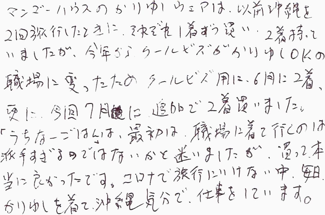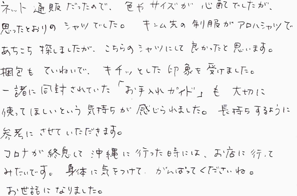 ネット通販だったので、色やサイズが心配でしたが、思ったとおりのシャツでした。キンム先の制服がアロハシャツであちこち探しましたが、こちらのシャツにして良かったと思います。梱包もていねいで、キチッとした印象を受けました。一緒に同封されていた「お手入れガイド」も大切に使ってほしいという気持ちが感じられました。長持ちするように参考にさせていただきます。コロナが終息して沖縄に行った時には、お店に行ってみたいです。身体に気をつけて、がんばってくださいね。お世話になりました。