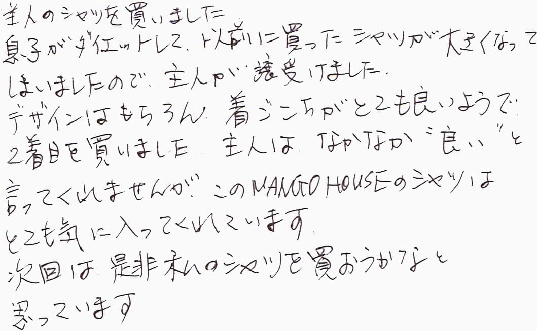 主人のシャツを買いました。息子がダイエットして、以前に買ったシャツが大きくなってしまいましたので、主人が譲受けました。デザインはもちろん、着ごこちがとても良いようで、2着目を買いました。主人は、なかなか“良い”と言ってくれませんが、このMANGO HOUSEのシャツはとても気に入ってくれています。次回は是非私のシャツを買おうかなと思っています。