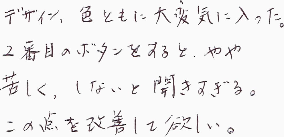デザイン、色ともに大変気に入った。2番目のボタンをすると、やや苦しく、しないと開きすぎる。この点を改善して欲しい。