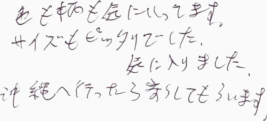 色も柄も気にいってます。サイズもピッタリでした。気に入りました。沖縄へ行ったら寄らしてもらいます。