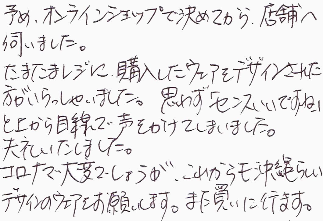 予め、オンラインショップで決めてから、店舗へ伺いました。たまたまレジに購入したウェアをデザインされた方がいらっしゃいました。思わず「センスいいですね」と上から目線で声をかけてしまいました。失礼いたしました。コロナで大変でしょうが、これからも沖縄らしいデザインのウェアをお願いします。また買いに行ます。