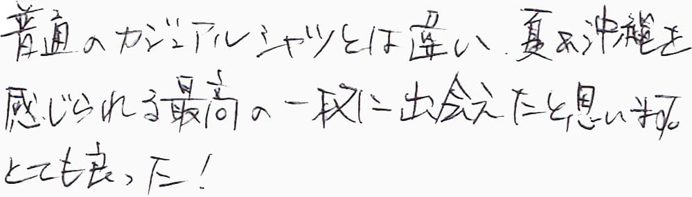 普通のカジュアルシャツとは違い、夏&沖縄を感じられる最高の一枚に出会えたと思います。とても良かった!