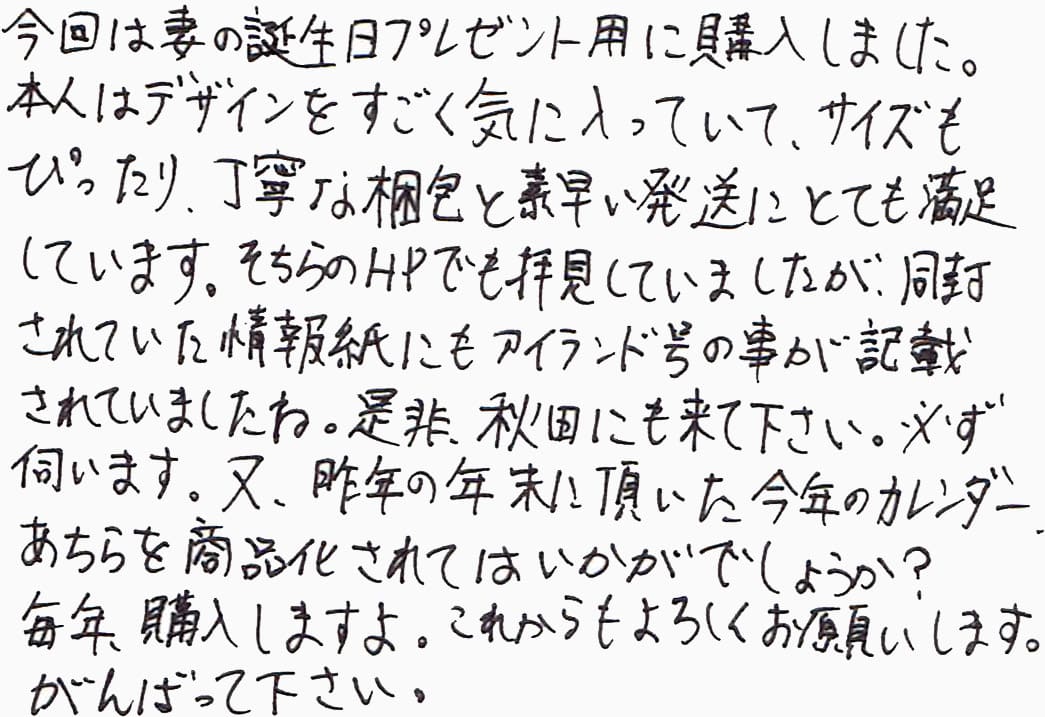 今回は妻の誕生日プレゼント用に購入しました。本人はデザインをすごく気に入っていて、サイズもぴったり、丁寧な梱包と素早い発送にとても満足しています。そちらのHPでも拝見していましたが、同封されていた情報紙にもアイランド号の事が記載されていましたね。是非、秋田にも来て下さい。必ず伺います。又、昨年の年末に頂いた今年のカレンダー、あちらを商品化されてはいかがでしょうか?毎年、購入しますよ。これからもよろしくお願いします。がんばって下さい。