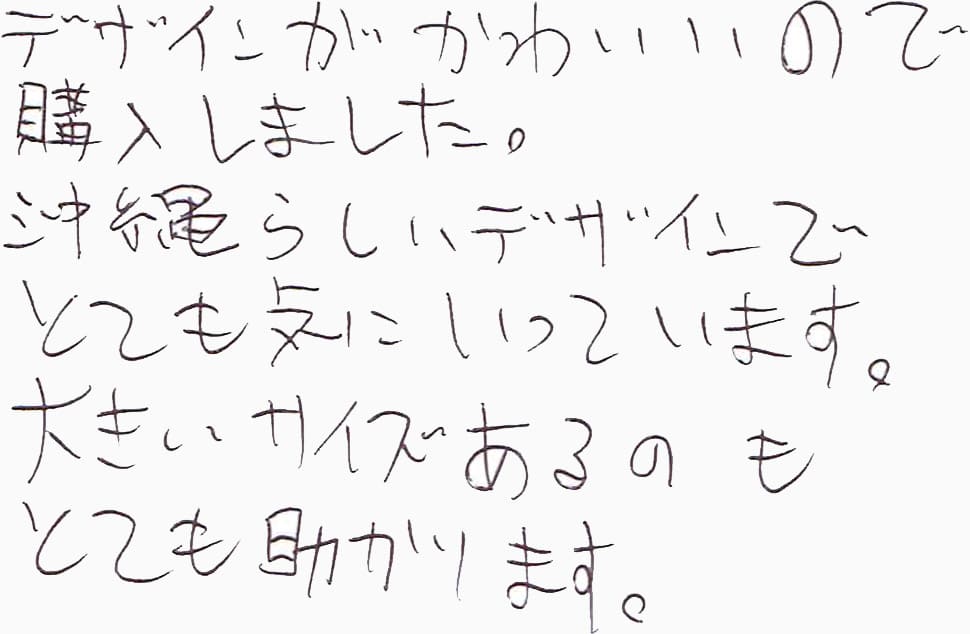 デザインがかわいいので購入しました。沖縄らしいデザインでとても気にいっています。大きいサイズあるのもとても助かります。