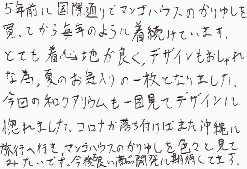 5年前に国際通りでマンゴハウスのかりゆしを買ってから毎年のように着続けています。とても着心地が良く、デザインもおしゃれな為、夏のお気に入りの一枚となりました。今回の和クアリウムも一見見てデザインに惚れました。コロナが落ち付けばまた沖縄に旅行へ行き、マンゴハウスのかりゆしを色々と見てみたいです。今後も良い商品開発に期待してます。