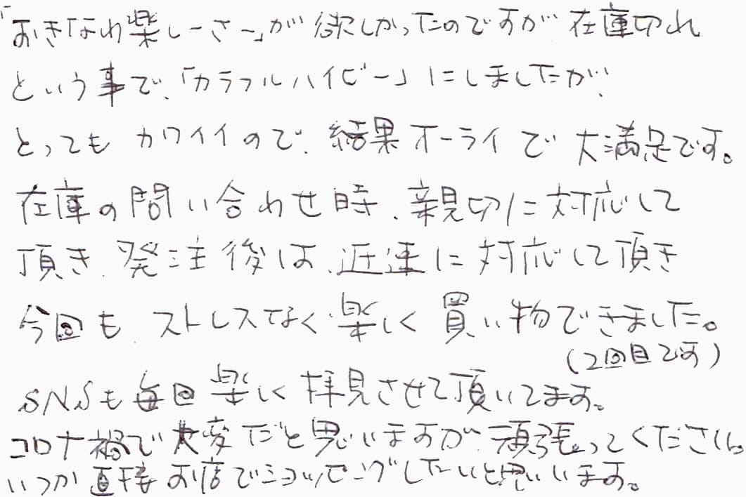 「おきなわ楽しーさー」が欲しかったのですが、在庫切れという事で、「カラフルハイビー」にしましたが、とってもカワイイので、結果オーライで大満足です。在庫の問い合わせ時、親切に対応して頂き、発注後は迅速に対応して頂き、今回も、ストレスなく楽しく買い物できました。(2回目です。)SNSも毎回楽しく拝見させて頂いてます。コロナ禍で大変だと思いますが、頑張ってください。いつか直接お店でショッピングしたいと思います。