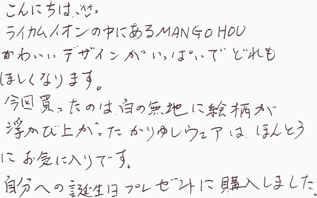 ライカムイオンの中にあるMANGOHOUかわいいデザインがいっぱいでどれもほしくなります。今回買ったのは、白の無地に絵柄が浮かび上がったかりゆしウェアは、ほんとうにお気に入りです。自分への誕生日プレゼントに購入しました。