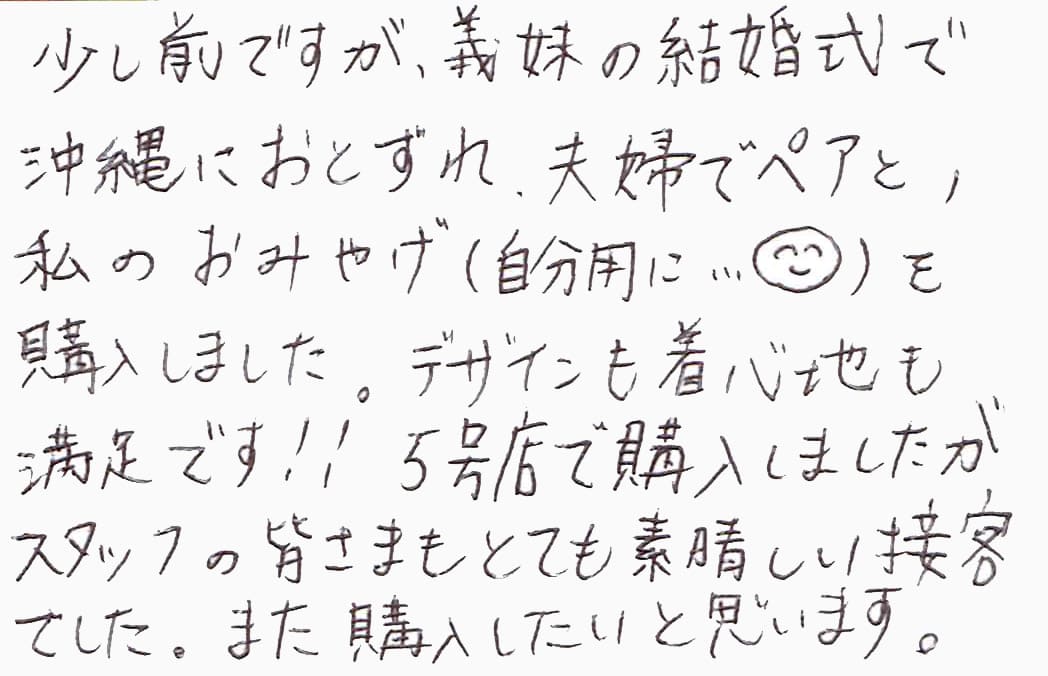少し前ですが、義妹の結婚式で沖縄におとずれ、夫婦でペアと、私のおみやげ(自分用に…)を購入しました。デザインも着心地も満足です!!5号店で購入しましたがスタッフの皆さまもとても素晴らしい接客でした。また購入したいと思います。