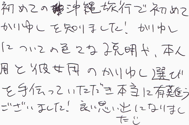 初めての沖縄旅行で初めてかりゆしを知りました!かりゆしについての色々な説明や、本人用と彼女用のかりゆし選びを手伝っていただき本当に有難うございました!良い思い出になりました。
