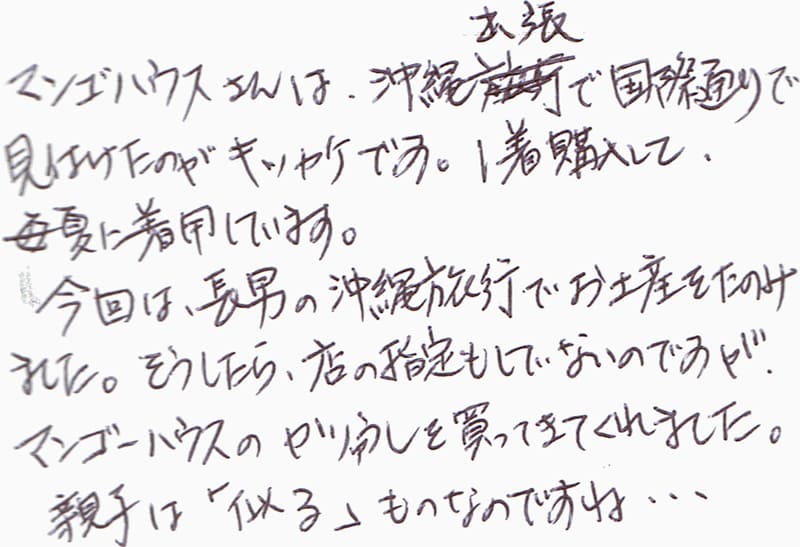 マンゴハウスさんは、沖縄出張で国際通りで見付けたのがキッカケです。1着購入して、毎夏に着用しています。今回は、長男の沖縄旅行でお土産をたのみました。そうしたら、店の指定もしていないのですが、マンゴーハウスのかりゆしを買ってきてくれました。親子は「似る」ものなのですね・・・