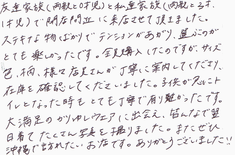 友達家族(両親と0歳児)と私達家族(両親と3才、1才児)で閉店間近に来店させて頂きました。ステキな物ばかりでテンションがあがり、選ぶのがとても楽しかったです。全員購入したのですが、サイズ、色、柄、様々店員さんが丁寧に案内してくださり、在庫を確認してくださいました。子供が急にトイレとなった時もとても丁寧で有り難かったです。大満足のかりゆしウェアに出会え、皆で翌日着てたくさん写真を撮りました。またぜひ沖縄で訪れたいお店です。ありがとうございました!!