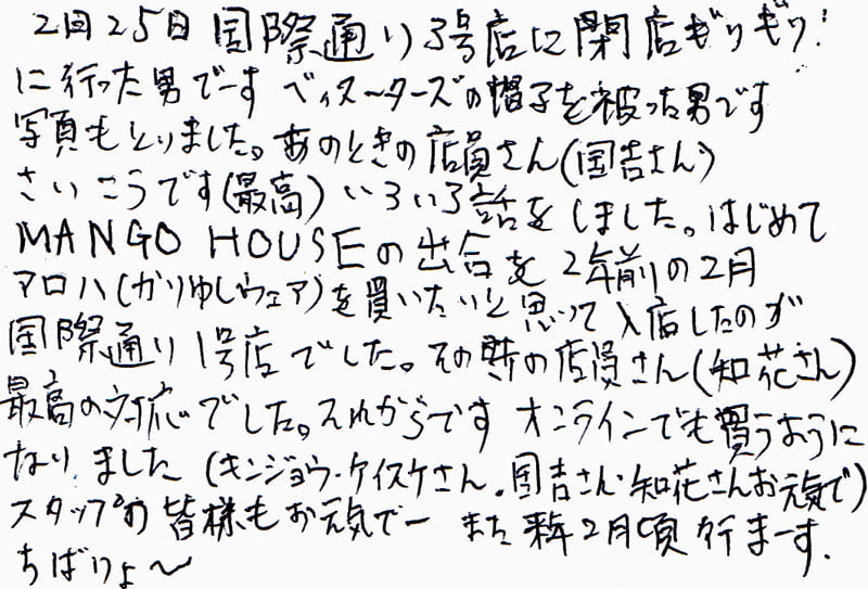 2月25日国際通り3号店に閉店ギリギリに行った男でーす。ベィスターズの帽子を被った男です。写真もとりました。あのときの店員さん(国吉さん)さいこうです(最高)いろいろ話をしました。はじめてMANGOHOUSEの出合を2年前の2月アロハ(かりゆしウェア)を買いたいと思って入店したのですが国際通り1号店でした。その時の店員さん(知花さん)最高の対応でした。それからですオンラインでも買うようになりました(キンジョウケイスケさん。国吉さん・知花さんお元気で)スタッフの皆様もお元気でーまた来年2月頃行まーす。ちばりょ~