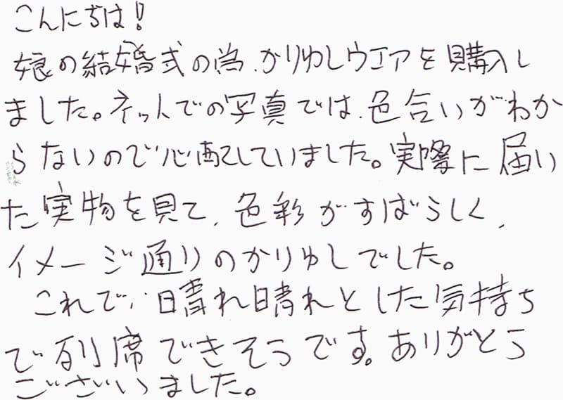 娘の結婚式の為、かりゆしウェアを購入しました。ネットでの写真では、色合いがわからないので心配していました。実際に届いた実物を見て、色彩がすばらしく、イメージ通りのかりゆしでした。これで、晴れ晴れとした気持ちで列席できそうです。ありがとうございました。