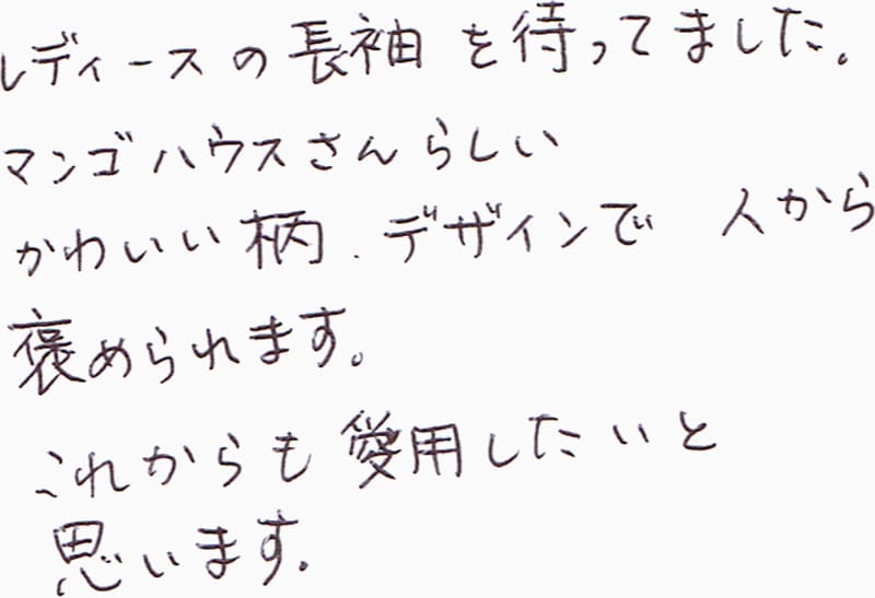 レディースの長袖を待ってました。マンゴハウスさんらしいかわいい柄、デザインで人から褒められます。これからも愛用したいと思います。