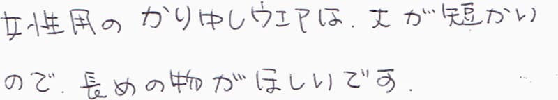 女性用のかりゆしウェアは、丈が短かいので、長めの物がほしいです。