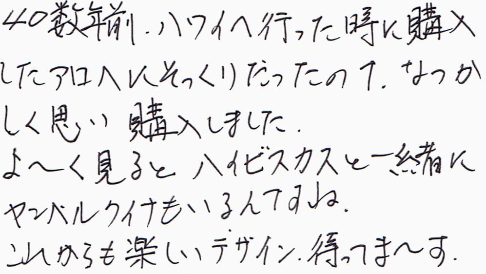 40数年前、ハワイへ行った時に購入したアロハにそっくりだったので、なつかしく思い購入しました。よ~く見るとハイビスカスと一緒にヤンバルクイナもいるんですね。これからも楽しいデザイン、待ってま~す。
