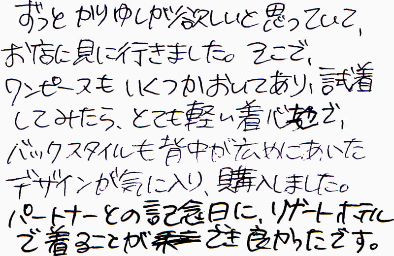 ずっとかりゆしが欲しいと思っていて、お店に見に行きました。そこで、ワンピースもいくつかおいてあり、試着してみたら、とても軽い着心地で、バックスタイルも背中が広めにあいたデザインが気に入り、購入しました。パートナーとの記念日に、リゾートホテルで着ることができ良かったです。