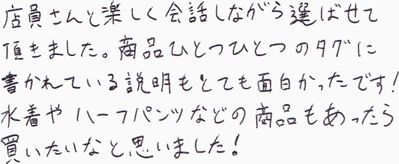 店員さんと楽しく会話しながら選ばせて頂きました。商品ひとつひとつのタグに書かれている説明もとても面白かったです!水着やハーフパンツなどの商品もあったら買いたいなと思いました!