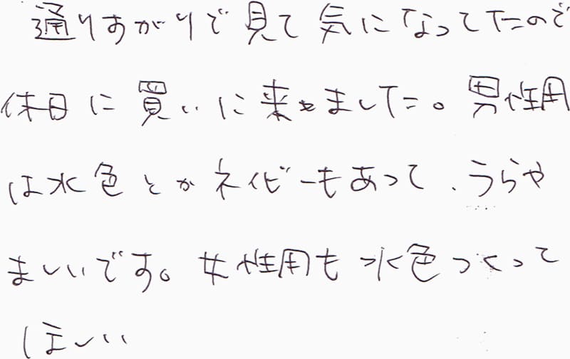 通りすがりで見て気になってたので休日に買いに来ました。男性用は水色とかネイビーもあって、うらやましいです。女性用も水色つくってほしい