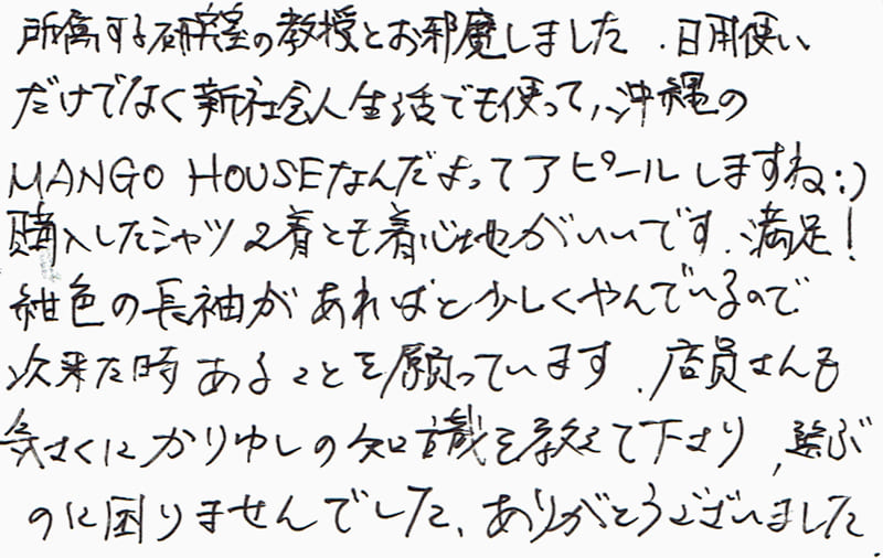 所属する研究室の教授とお邪魔しました。日用使いだけでなく新社会人生活でも使って、沖縄のMANGOHOUSEなんだよってアピールしますね。購入したシャツ2着とも着心地がいいです。満足!紺色の長袖があればと少しくやんでいるので次来た時あることを願っています。店員さんも気さくにかりゆしの知識を教えて下さり、選ぶのに困りませんでした。ありがとうございました。